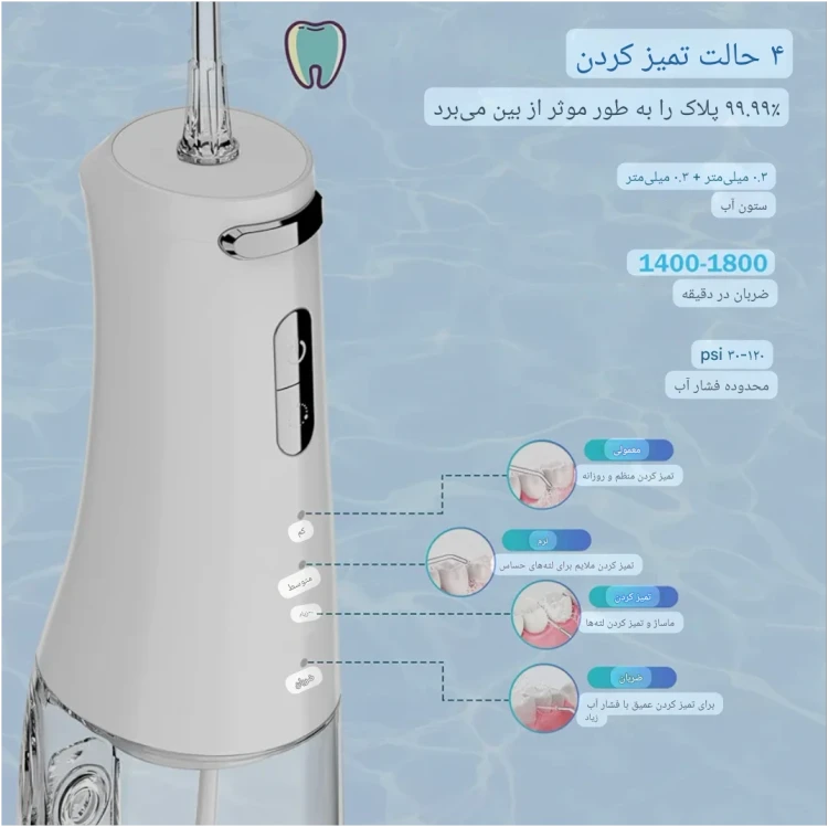 این دستگاه با نامهای واتر فلوسر، واترپیک، جرمگیر دهان و دندان، دهانشوی برقی نیز شناخته میشود و با پاشش ضربهای آب (1200–1400 پالس در دقیقه) تمام باقیماندههای غذایی و پلاکهای بین دندان را از بین میبرد.